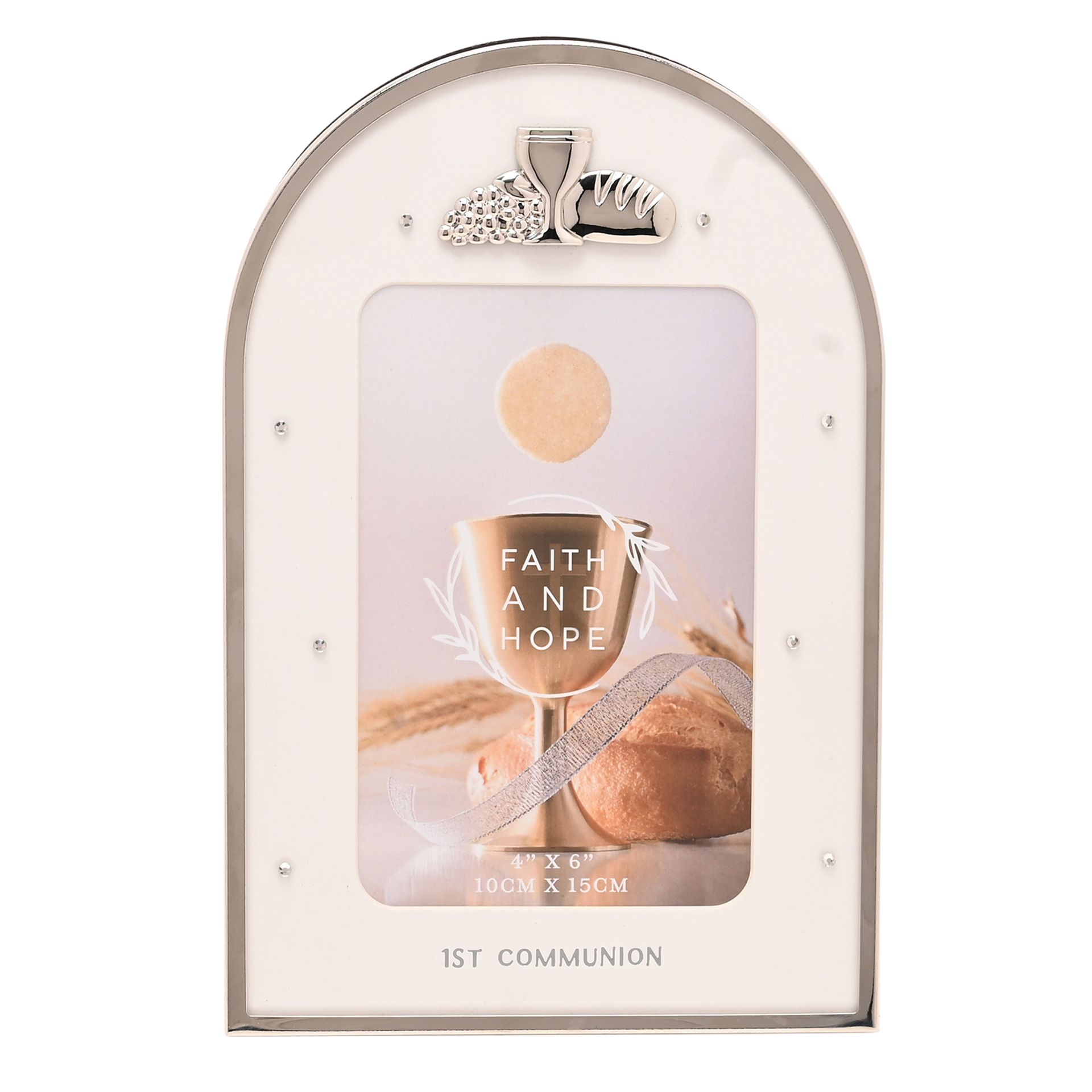 Arch Communion Photo Frame featuring a soft arched shape, neutral colour palette, and delicate symbolic details such as crosses, doves, and angels, it offers a modern alternative to traditional Communion, Confirmation, or Christening gifts. Complete with a strut stand, it’s easy to display on any shelf, mantel, or table.