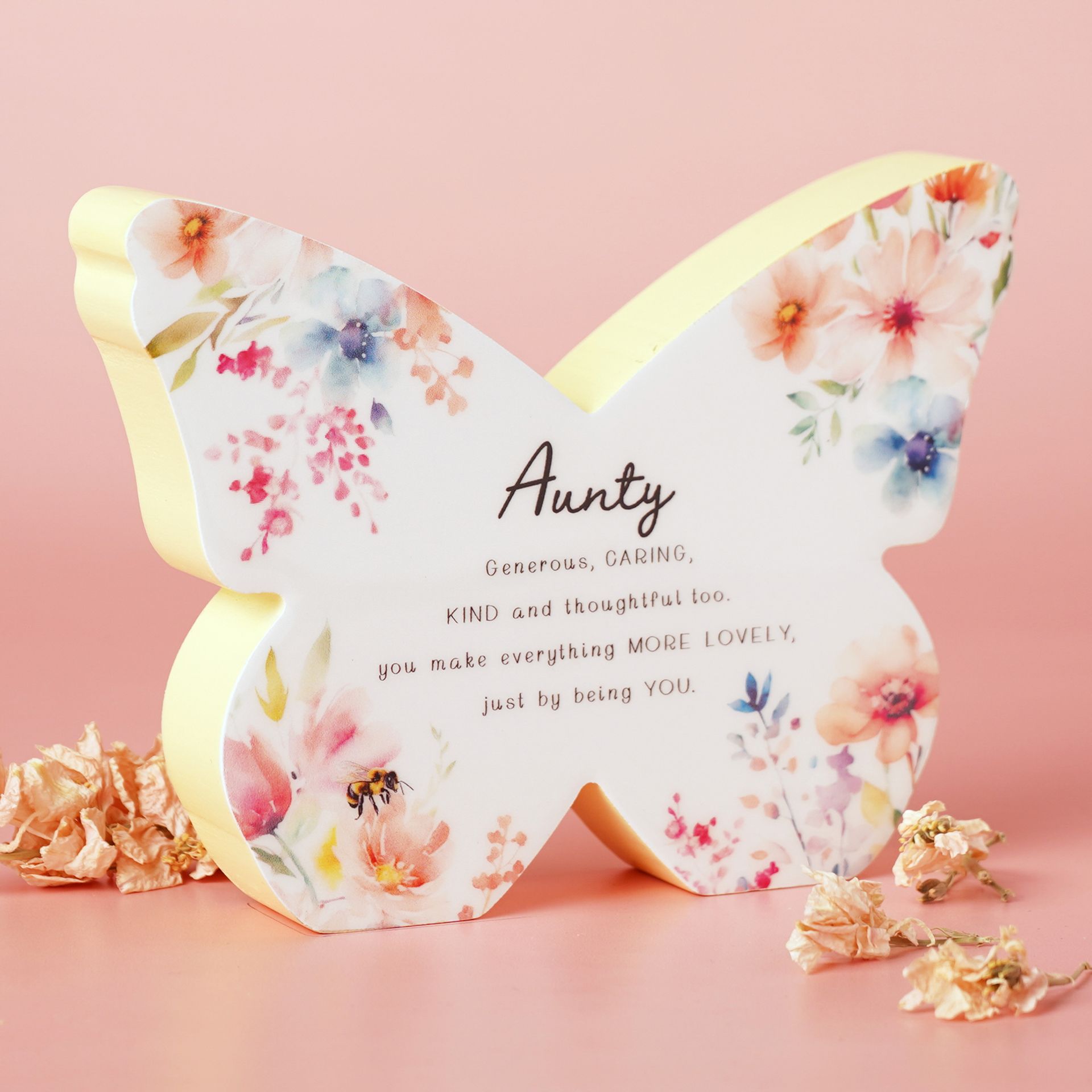 Add a fresh floral touch to the home with The Aunty Butterfly Mantel Plaque. Featuring a bold butterfly silhouette paired with soft watercolour florals and an uplifting message, this decorative MDF piece brings a contemporary twist to classic gifting. Perfect for styling on shelves, desks, or mantelpieces, it’s a thoughtful choice for birthdays, thank-yous, or just-because moments — adding instant colour and personality to any space.