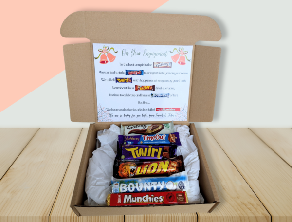 Celebrate their love story with the Engagement Chocolate Poem Gift Box, featuring six full-sized treats from Cadbury & Nestlé. With a heartfelt poem and the option to add a personalised message, it’s the perfect way to share in their joy and excitement for this special milestone.