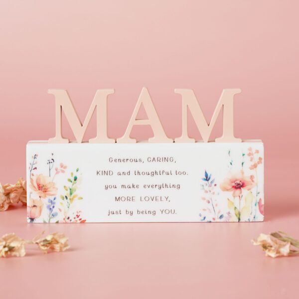 Celebrate Mam with The Mam Flower & Bee Word Plaque. This decorative MDF block sign features bold cut-out “Mam” lettering, beautifully paired with soft watercolour floral artwork and uplifting wording. Designed to sit neatly on shelves, mantels, or desks, it adds a pop of colour and heartfelt sentiment to any space. A lovely gift choice for Mother’s Day, birthdays, or simply to show your appreciation.